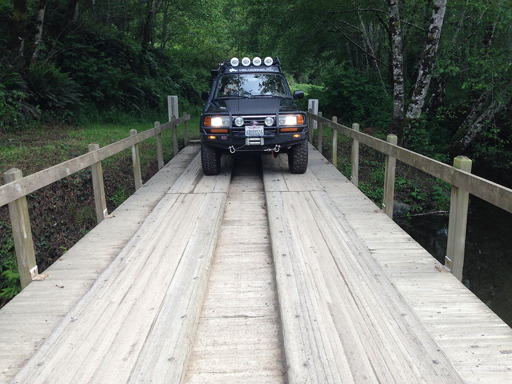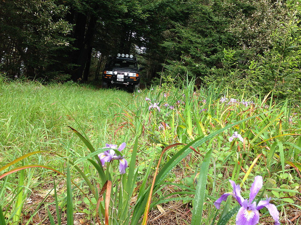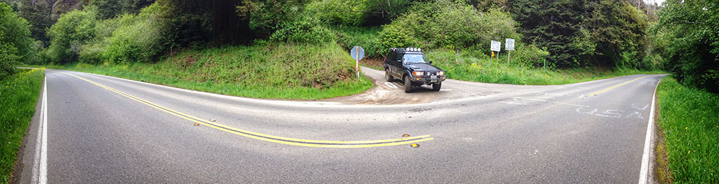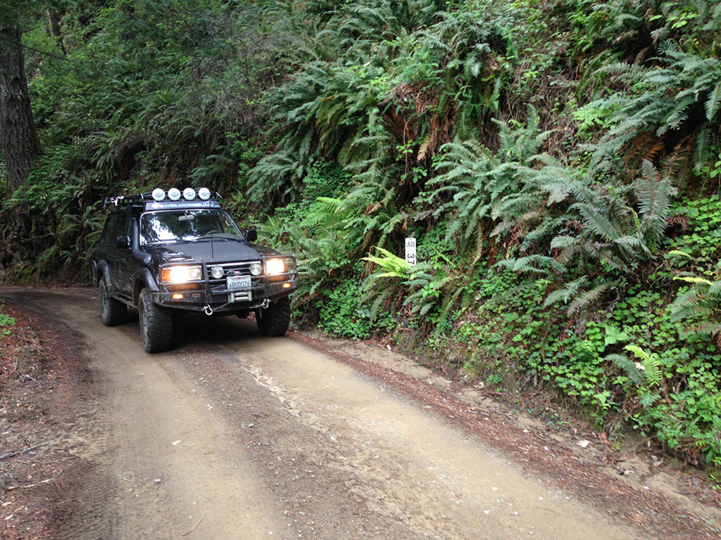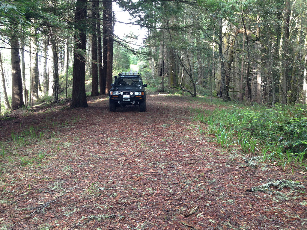 The road quickly turns to dirt, and gets interesting for street machines and lowered Civics, but will be no problem for any car with stock clearance if you drive carefully. This is a good route for Overlanders who don’t feel like scratching their rigs! 🙂 The trail is very nice, and surrounded by redwoods.